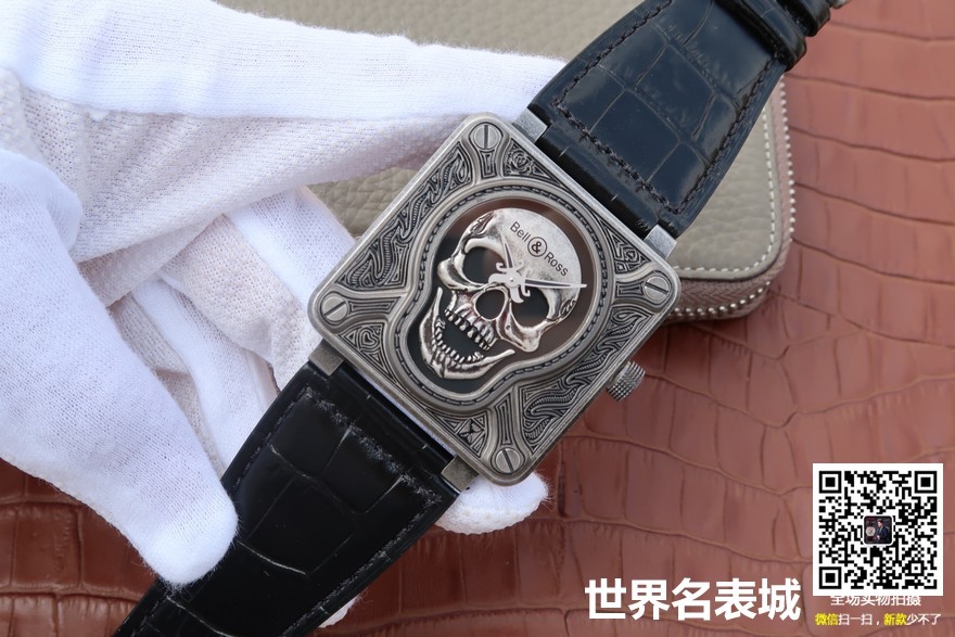 > 柏莱士 Bell & Ross > 【TW厂出品】柏莱士AVIATION系列BR 01 BURNING SKULL。台湾工厂1:1原装开模出品 ,正面侧面底盖均为手工雕花填油,纹身式浮雕,男士手表,46mm直径,皮表带,自动机械机芯,密底