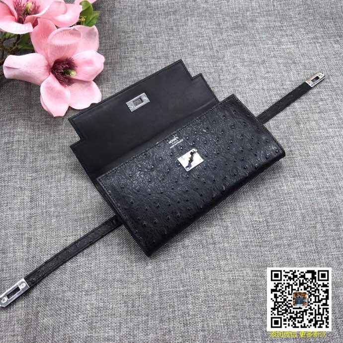 HERMES kelly bag钱包手包两用款 型号:H361鸵鸟纹(黑色) 材质:鸵鸟纹皮 尺寸:20cm*11cm
