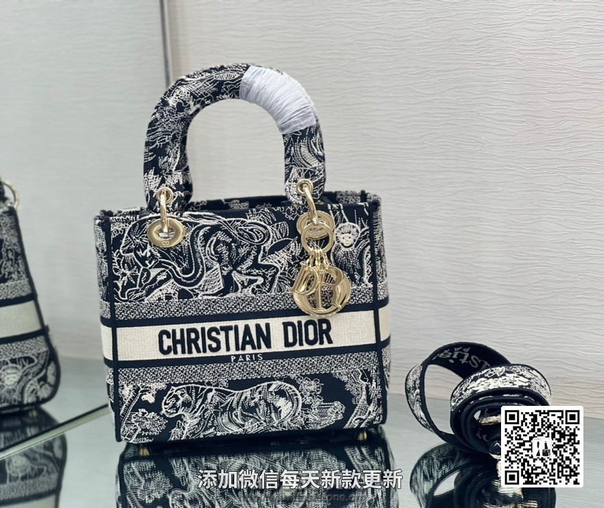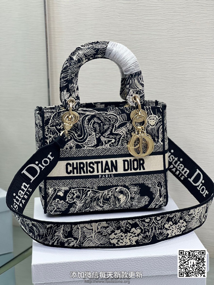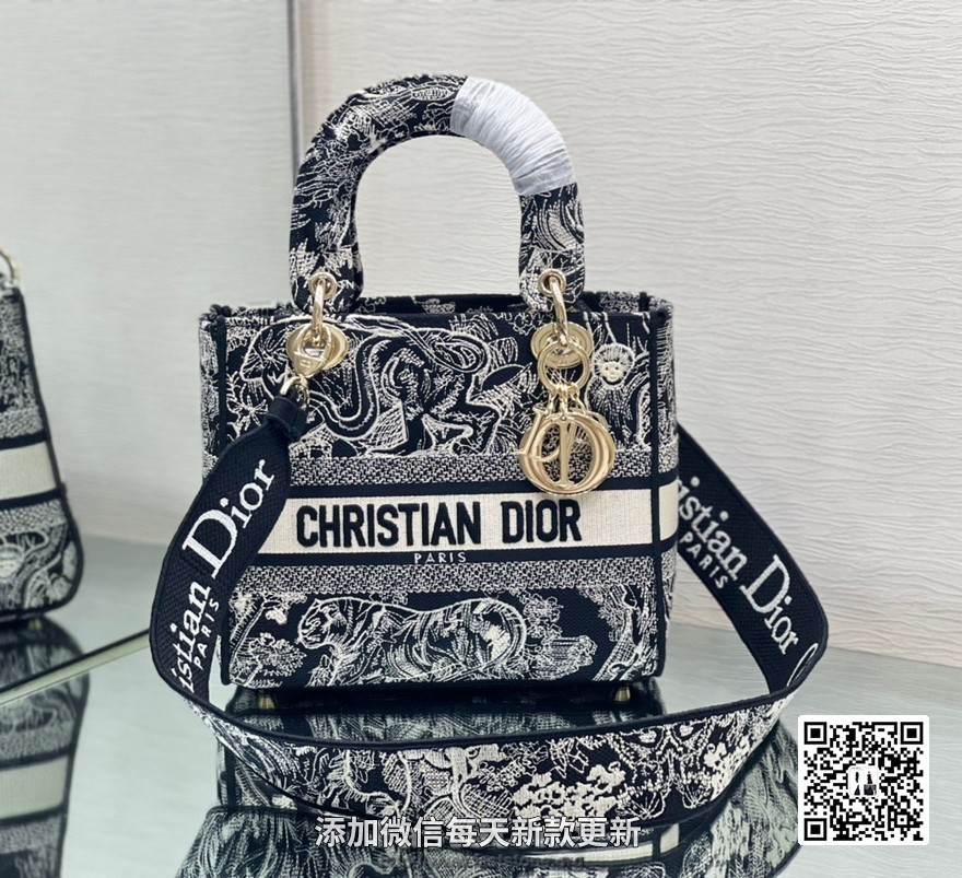 【原单刺绣戴妃】黑色老虎 刺绣戴妃包 标志时尚而柔美。饰以标志性“D.I.O.R.”吊饰,为精美的轮廓增添一分灵动。搭配大号可拆卸双面刺绣肩带,可随心选择背挎方式。可拆卸双面刺绣宽肩带,内部拉链口袋和贴袋,可手提、肩背或斜挎,可随心搭配其他刺绣肩带。尺寸:24 厘米 x 20 厘米 x 11 厘米 款号:M0565